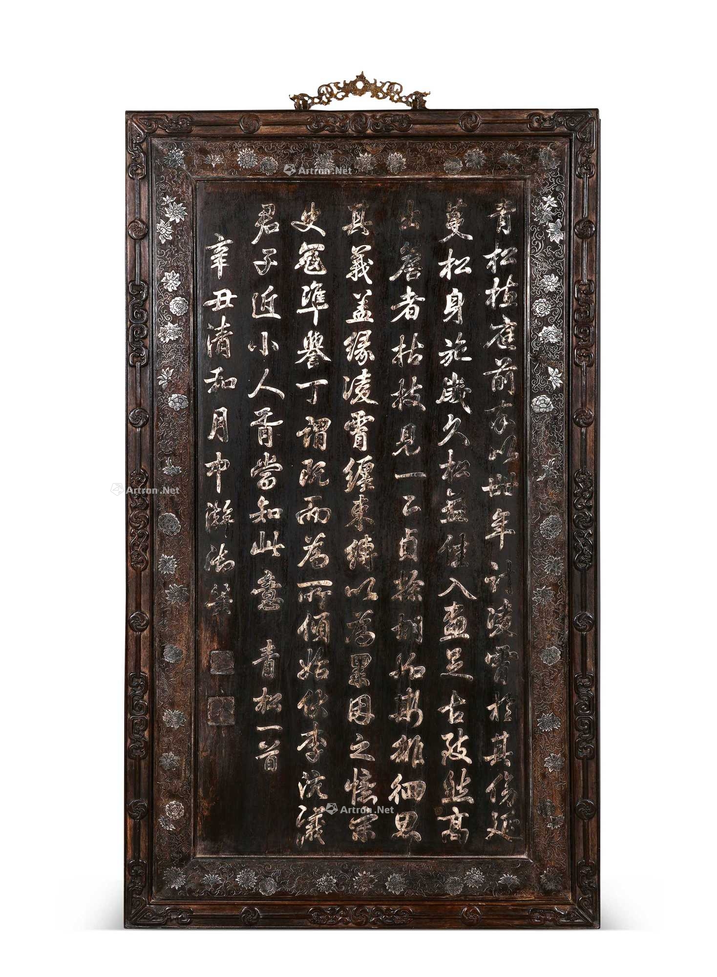 说明:挂屏紫檀大料而作,因其色泽沉静、纹理优美,质地坚硬,故清代宫廷推崇紫檀。技法以银丝或银片镶嵌图案与诗文,形成立体浮雕效果,工艺精细,体现清代宫廷艺术的集大成,此件作品既体现贵族威仪,又满足文人雅趣。