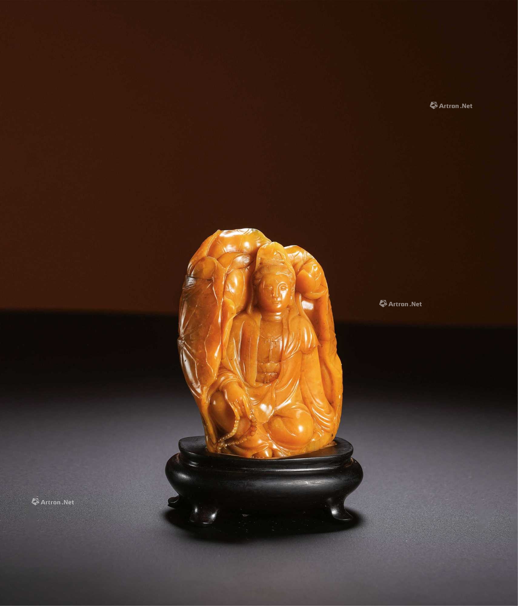 说明:此件莲池观音造像,取材于寿山田黄石中的上品 “鸡油黄”,石质细腻如脂,上手温润如玉,自然光下可见丝丝缕缕的萝卜纹隐现其间,观音摆件构图主次分明,密实而不显拥挤,有密不透风之致。观音坐在莲叶之中,手拿佛珠,表情安详,体态温婉。整件作品线条清晰流畅,刀法娴熟。