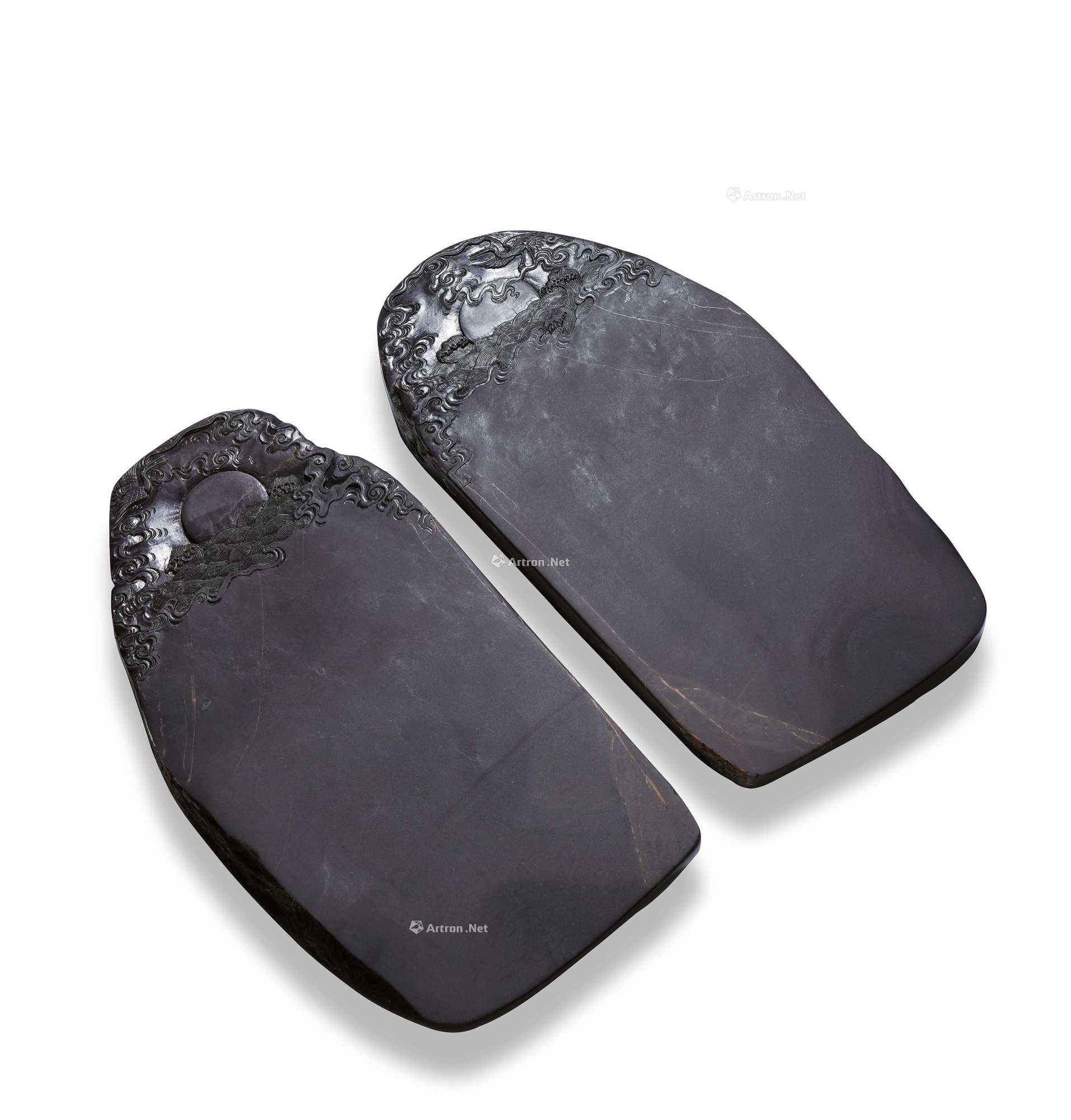 说明:砚石取材老坑石,原有天然石痕一道,雕者巧妙破石为二,取石品最优美之处置于砚堂之上。砚额用简练的线条刻画日月同辉的壮丽景象,寓意美好和谐。