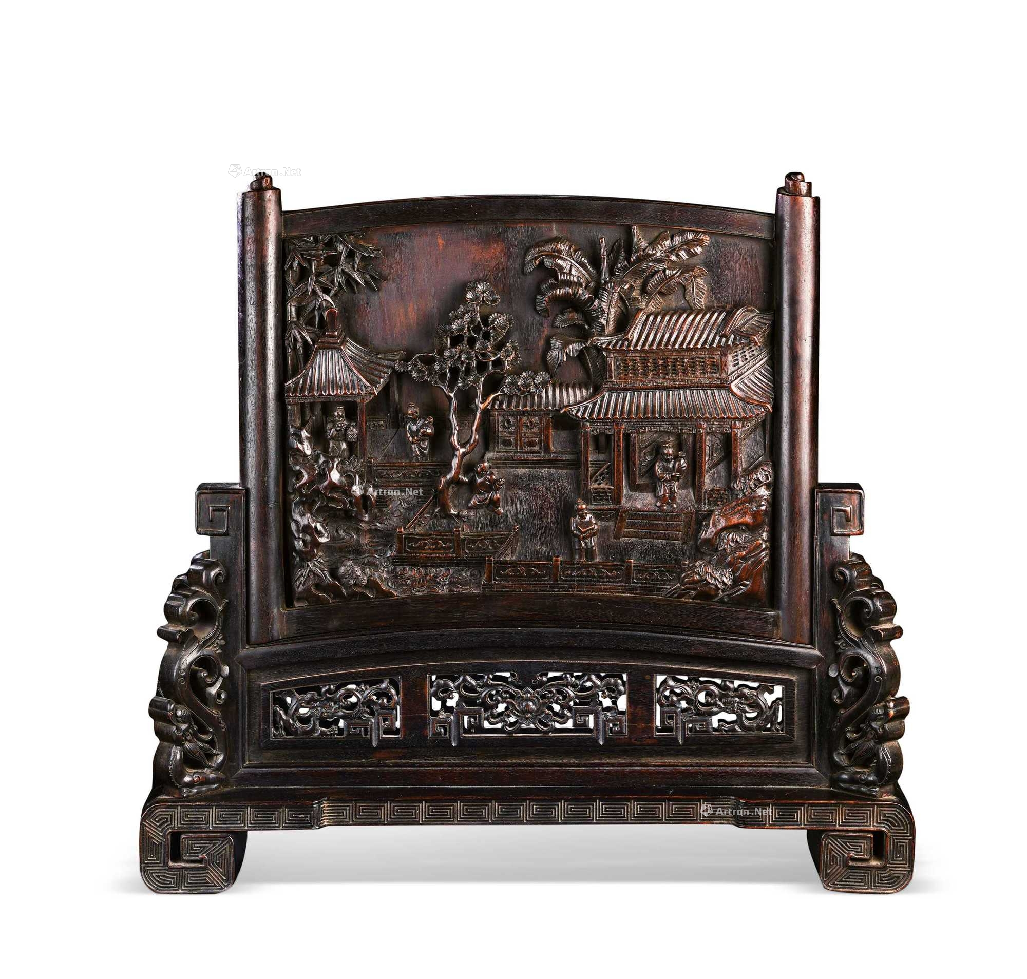 说明:此插屏采用紫檀木制,质地坚硬细密,木纹纤细,变化无穷,长时间的使用和氧化后,形成深邃温润的包浆。插屏上的雕刻运用了浮雕、透雕等多种技法,人物、建筑、树木等元素层次分明,立体感强。人物的衣纹、表情,建筑的门窗、瓦片,树木的枝叶等都雕刻得细致入微,展现出高超的工艺水平。画面布局合理,疏密得当。以建筑为背景,人物活动穿插其中,营造出一种生动的场景感。在传统观念中,画面中的建筑象征着安稳和富足,树木代表着生机与长寿。整体插屏放置于室内,有祈求吉祥、平安的美好愿望。