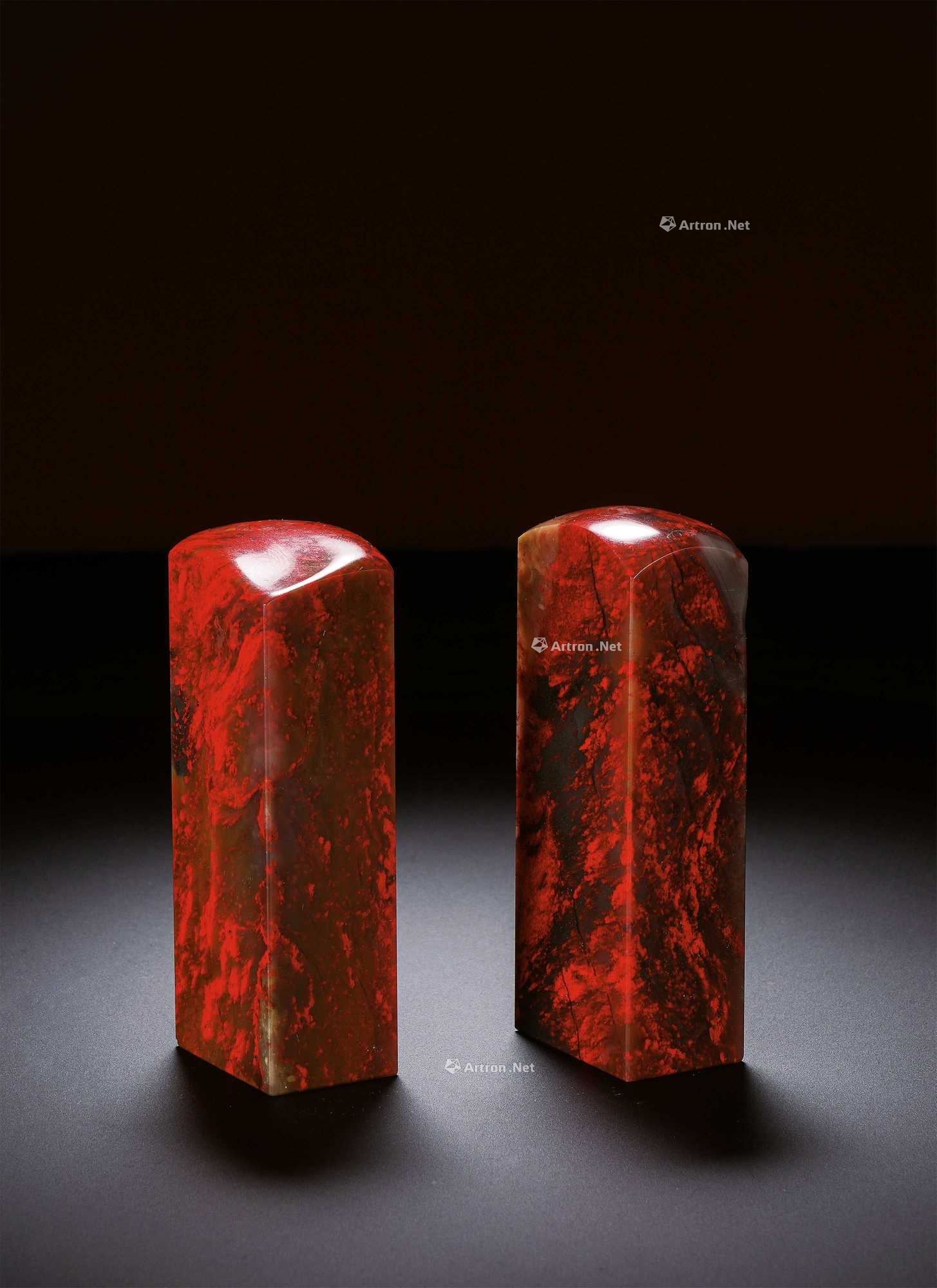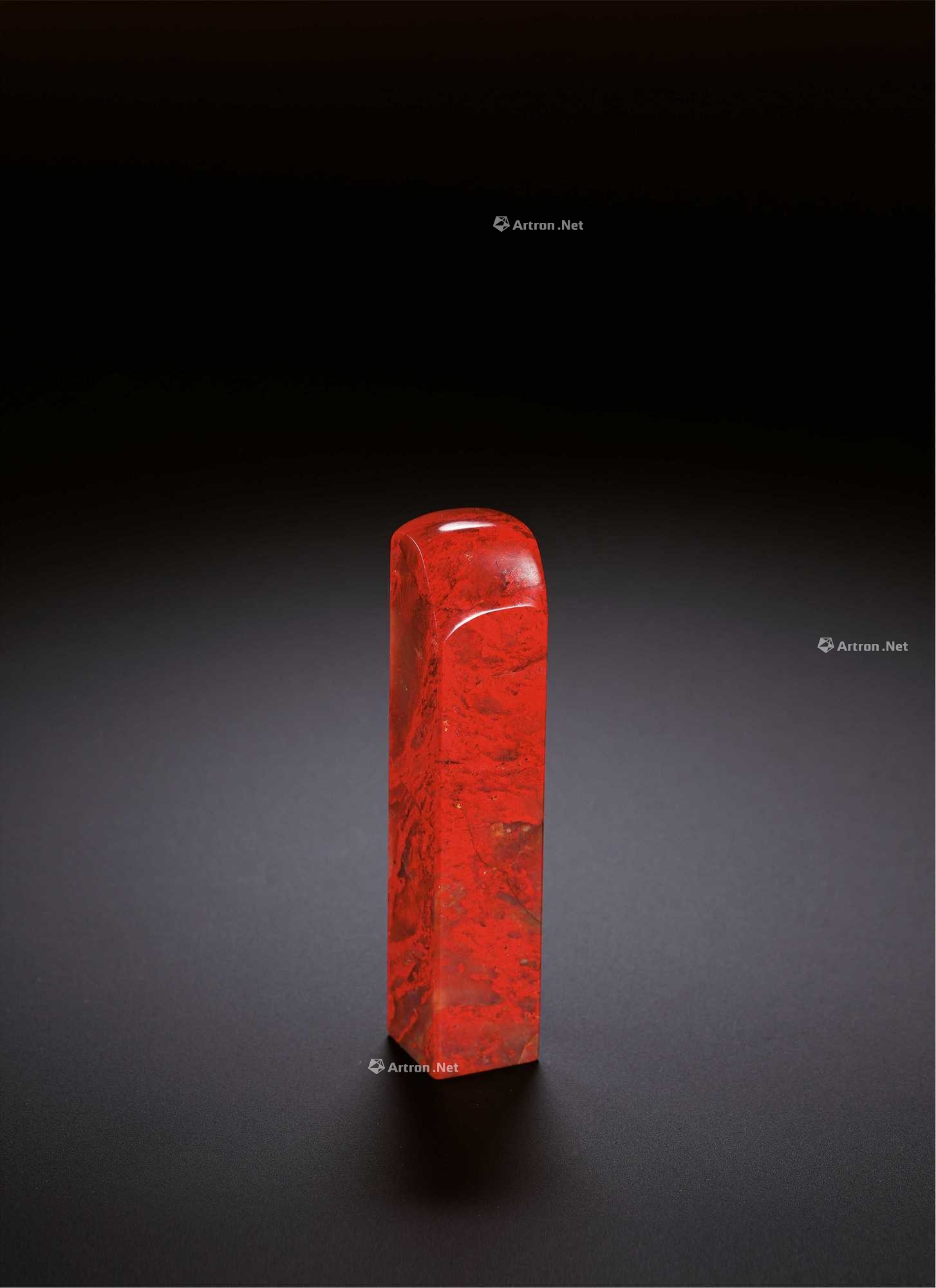 这枚素方章的血色,正是 “大红袍” 的典型体现,色泽鲜丽而不艳俗,红得醇厚、红得饱满,如初凝的鸡血,在灯光下甚至能透出隐隐的胶质光泽。更难得的是,其地子(血色之外的基底)细腻温润,呈半透明的 “冻地” 质感,与浓郁的血色交相辉映,恰如 “红霞映雪”,将鸡血石 “血” 与 “地” 的美学张力推到极致。拍品为荣宝斋库出,实为难能可贵,属案头陈设珍藏之上品。