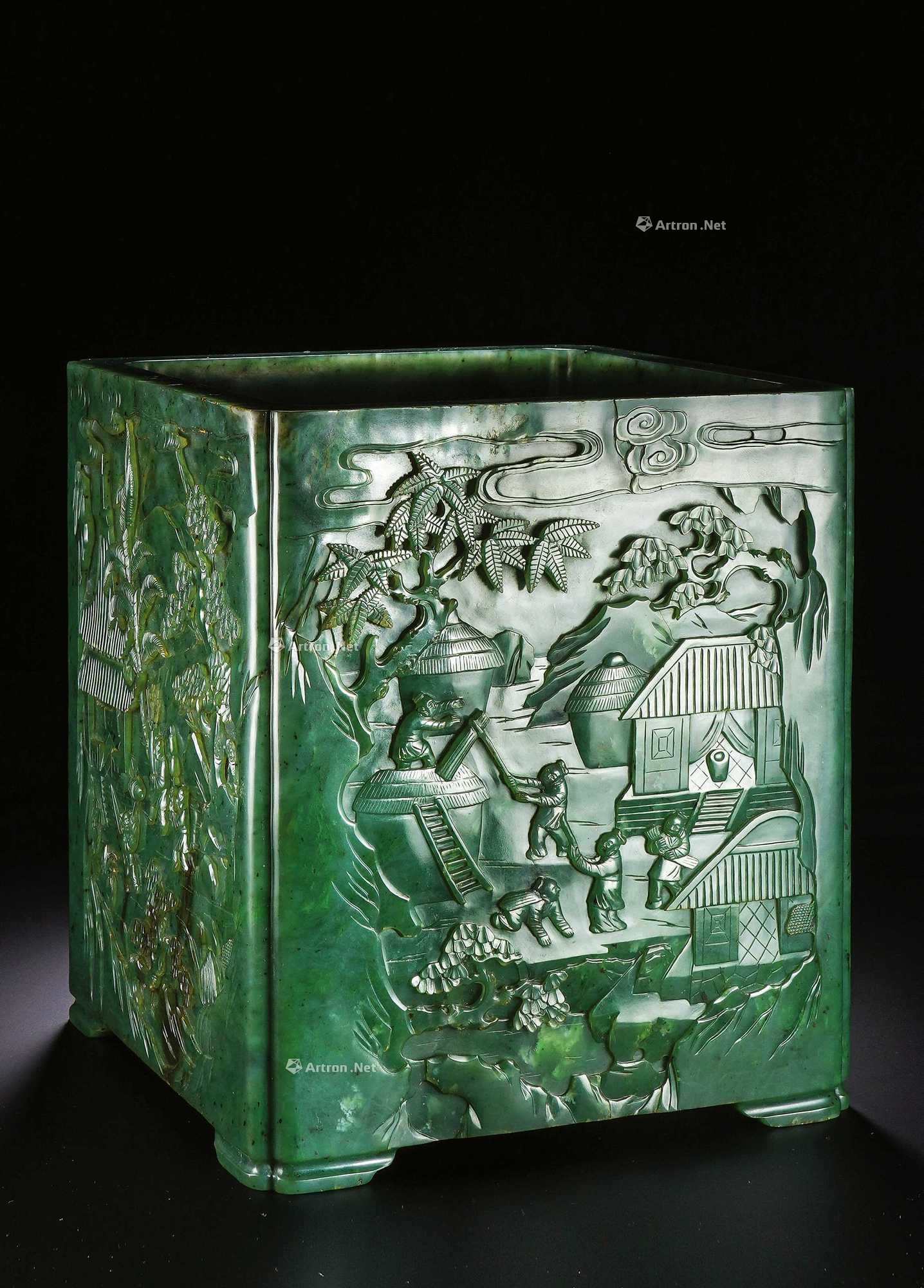 碧玉凝翠,婴戏藏趣这件清碧玉雕婴戏图大四方笔筒,以碧玉为材,雕琢婴戏图景,是清代玉雕文房中的精品。