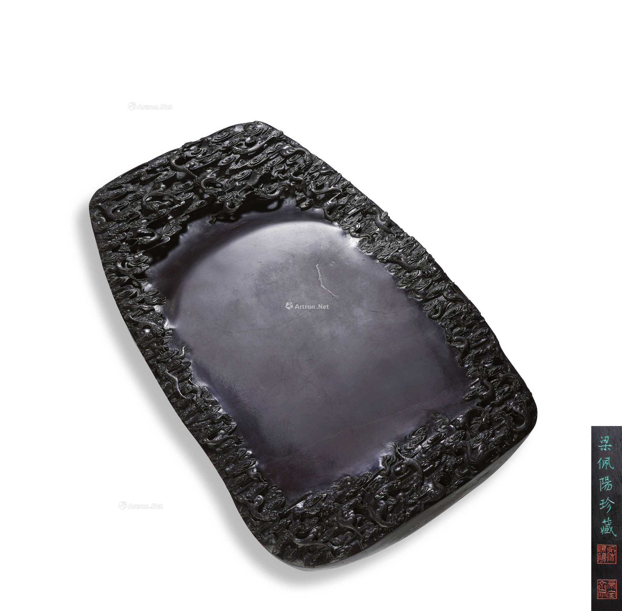拍品选用端砚名坑——麻子坑石。麻子坑石质细腻温润,密度极高,发墨快且墨色浓润,是砚中上乘之选。石面上隐约可见的纹理,如星点、如冰裂,是麻子坑的天然标识,历经岁月仍显坚密,为其实用与收藏价值奠定了坚实基础。七八十年代的制砚工艺,既传承了传统端砚雕刻的精髓,又融入了那个时代对宏大题材的艺术表达,让这方砚台在材质与工艺的结合上更具时代特色。“盛世龙腾” 的题材设计气势恢宏。砚台边缘雕刻群龙纹饰,龙纹形态各异,或腾云驾雾,或昂首嘶吼,雕刻技法精湛,浮雕、圆雕并用,将龙的威严与灵动刻画得栩栩如生。龙在中国文化中是权力、祥瑞的象征,“龙腾盛世” 的寓意既契合了时代对繁荣昌盛的期盼,又展现了传统吉祥文化的深厚底蕴。整体布局繁而不乱,龙纹与砚堂的留白形成鲜明对比,既凸显了雕刻的工艺之美,又保证了砚台的实用功能,体现了工匠对 “艺用结合” 的精妙把握。