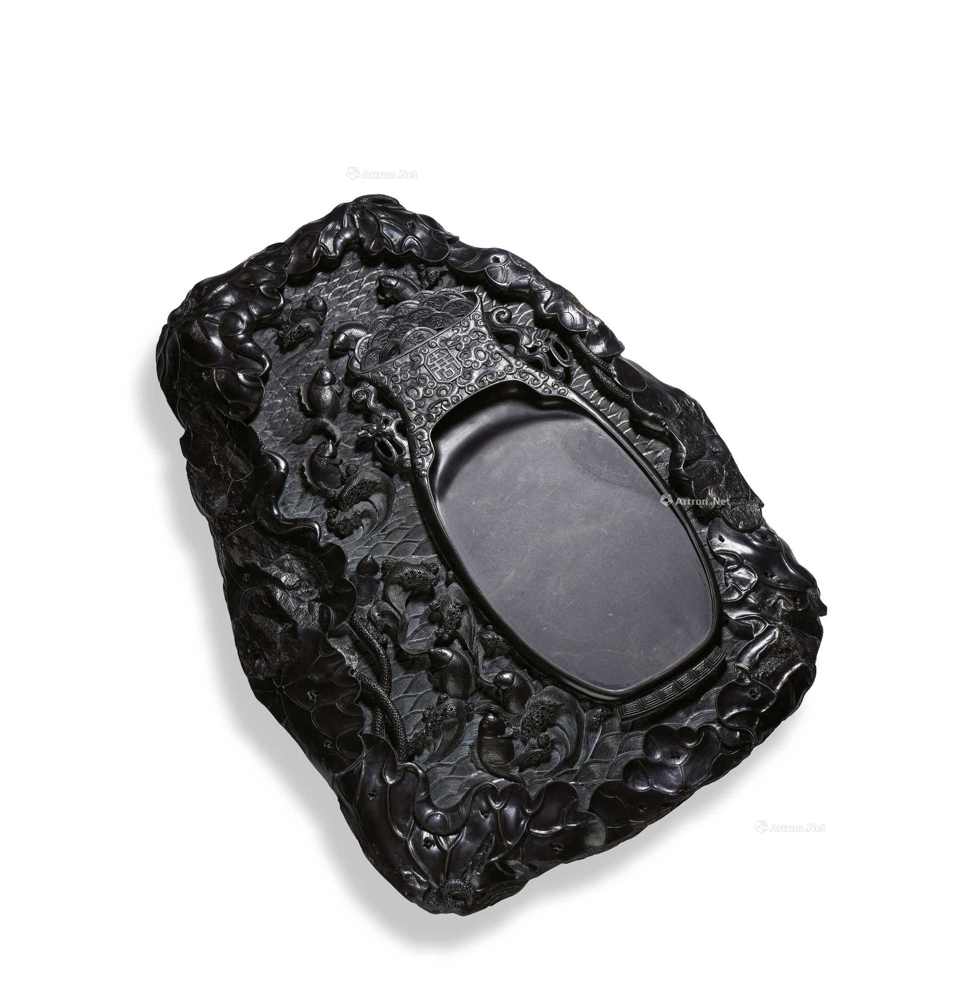 拍品老坑 “四海升平” 砚采用的是砚中珍品——老坑砚石。老坑石质致密温润,呵气可研墨,发墨如油泛,且蕴含天然纹理,或如冰纹,或如金线,此砚石面的纹理便是老坑身份的佐证,历经岁月仍显细腻坚润,是砚中难得的上乘之材。七八十年代的制砚工艺,承继了传统砚雕的精髓,又带着那个时代对工艺精细度的追求,让这方砚台在材质与工艺的结合上更显珍贵。“四海升平” 的题材设计颇具深意。砚台主体雕刻宝瓶造型,宝瓶在中国文化中是平安、吉祥的象征,瓶身纹饰精美,“寿” 字元素的融入更添祈福之意。周围环绕的荷叶、游鱼,刻画得栩栩如生,荷叶舒展,游鱼灵动,既展现了自然之美,又暗合 “连年有余”“和和美美” 的吉祥寓意。整体布局繁而不乱,雕刻技法精湛,浮雕、圆雕技法并用,将宝瓶的庄重、荷叶的柔美、游鱼的鲜活刻画得淋漓尽致,每一处细节都彰显着工匠的巧思与功力。