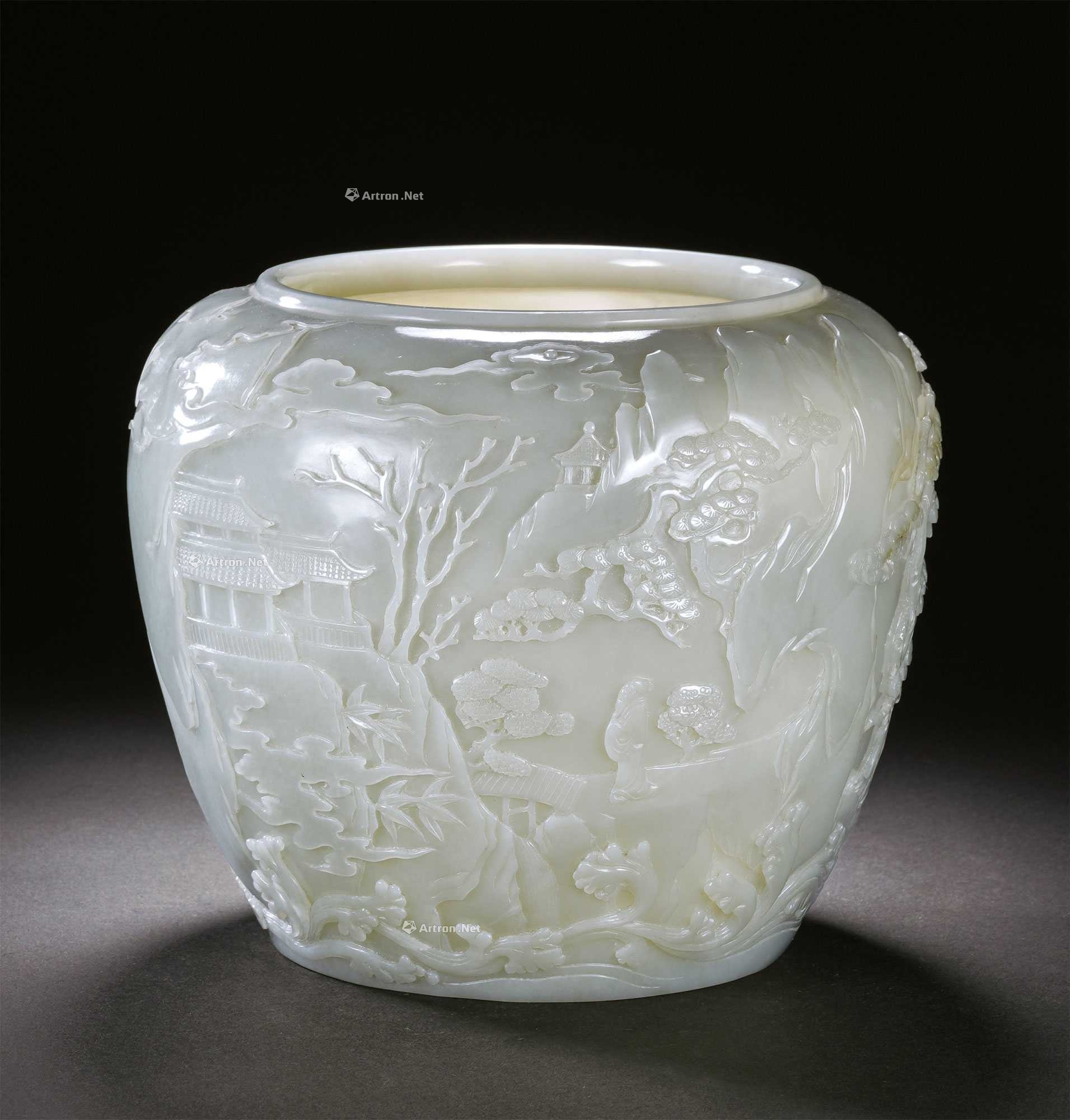说明:此卷缸采用白玉雕琢而成,白玉质地细腻温润,色泽均匀柔和,工匠运用了浮雕技法,使山水、人物等图案具有立体感,仿佛从玉质中自然浮现;雕刻工艺极为精细,线条流畅自然,缸体上雕刻了丰富的山水景观,有山峦起伏、云雾缭绕、树木葱茏、亭台楼阁等。这些元素构成了一幅宁静悠远的山水画卷,营造出一种空灵、清幽的意境。卷缸作为文房用品,本身就与文人活动密切相关,不仅具有实用功能,还承载了文人的雅趣和文化内涵,是文人书房中的一件精美陈设。