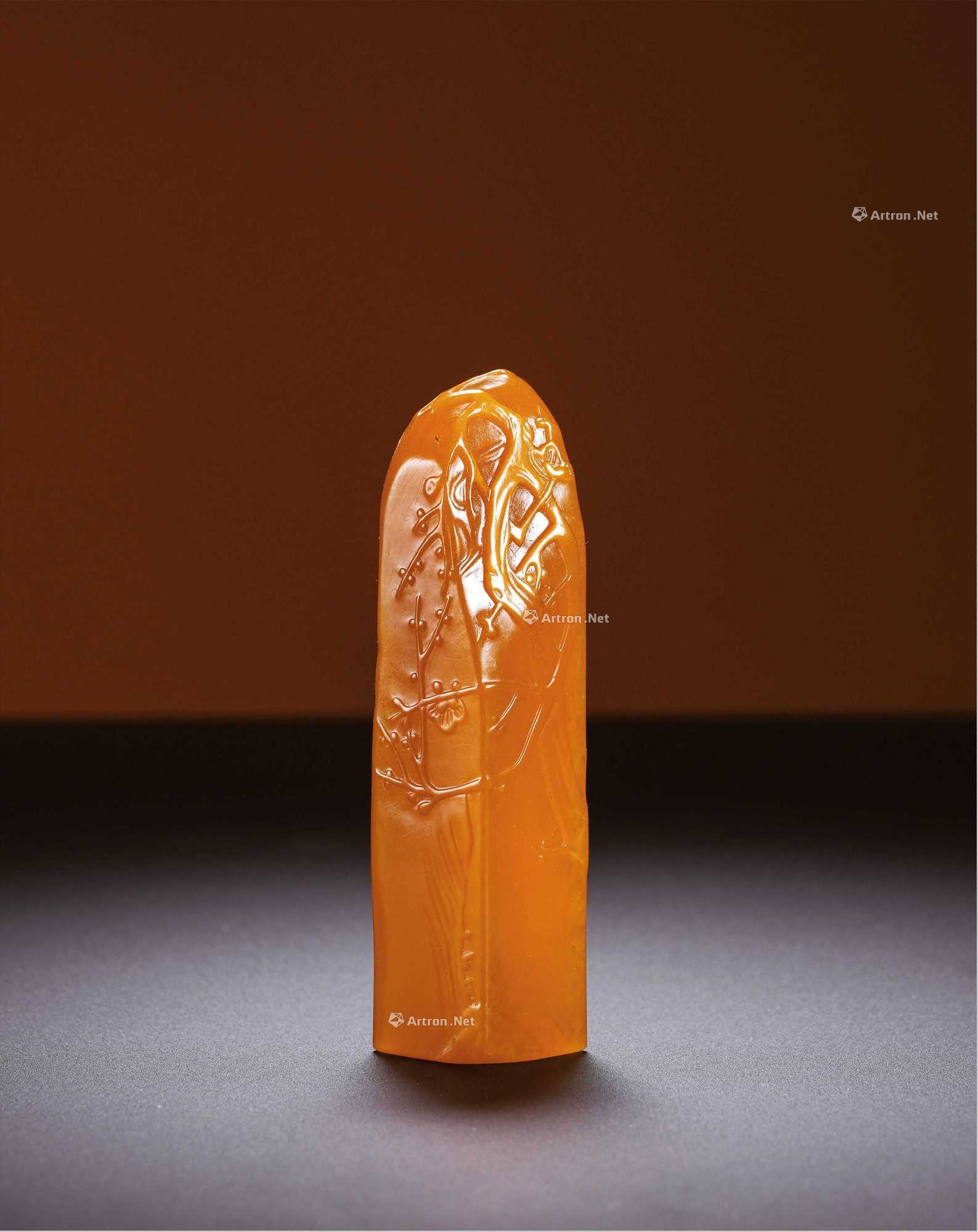 说明:这枚田黄石印章色泽金黄,质地温润凝灵,形态自然玲珑。作者以薄意手法在田黄石上雕刻一梅花,梅枝盘扎,梅花盛开,雀鸟立于枝头,似在鸣叫高歌,静中有动,动静结合,俨然一副微缩的中国传统书画作品。通体雕刻线条硬朗流畅,深雕浅刻,注重石头天然纹理走向,尤其是借天然石皮之分布而布局画面,疏密得当。这枚田黄摆件仅以一株梅花为薄意内容,也表现了君子立身处世,不因无人而不芳,不因困穷而改节的意蕴。