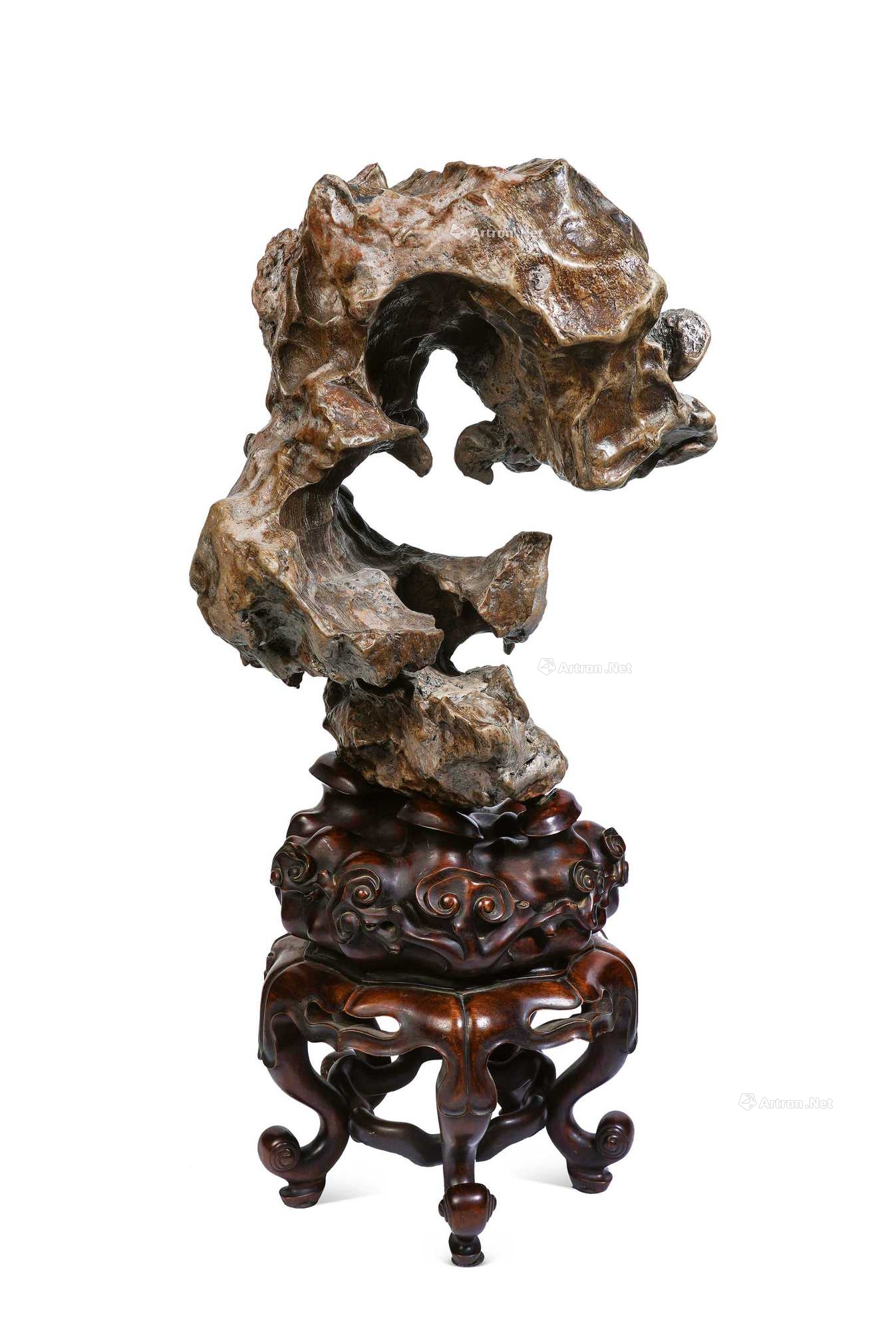 搭配的红木底座同样堪称精品,雕刻繁复的卷云纹,与灵璧石的古朴形成繁简对比,底座的曲线又与石体的折线呼应,既起到承托作用,又强化了 “小中见大” 的山水意境,尽显清代匠人 “相石配座” 的精湛功力。