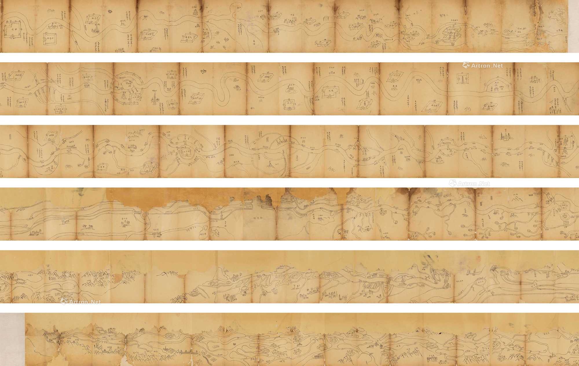是图首题“运河全图”,以墨笔绘制京杭大运河全图一长卷。此图卷首起于京杭大运河在京城的终点码头大通桥,卷尾止于杭州府海宁县。详细注明运道沿途的州县、山峦、闸坝、湖泊、河流、名胜。图中山东东平县绘有“安山”,此处原为金元时梁山泊的一部分。明中叶后,安山湖范围不断缩小,湖区大部分开垦为农田,湖形尚存,至明末淤废。故本图注“安山湖今淤称地”。清咸丰五年黄河在铜瓦厢决口北徙,夺大清河入海,抬高了原先汇入安山一带洼地河流的尾闾水位,安山湖向北扩展,并与黄河贯通。由于淹没地属东平县,始有东平湖之称。故此图表现年代为清咸丰以前。本图完整展现了京杭大运河的闸坝体系、河道工程及水源信息。例如详绘山东汶上南旺分水、江苏淮安清口等京杭大运河核心水利枢纽,及山东阿城陶城铺闸、东平戴村坝等重要水利工程。并绘有汶河、泇河等补给水系,图示马踏湖、蜀山湖等水源调节湖泊的分布形态。京杭大运河沿线的水系、湖泊、堤堰、闸坝等地理景观和水利工程设施,在本图都得到了详尽的展现。此《运河全图》不仅展示了清代京杭大运河的真实情况,更为我们提供了深入了解大运河文化、清代漕运的文献资料,也是展示大运河——这一世界文化遗产的舆图代表。