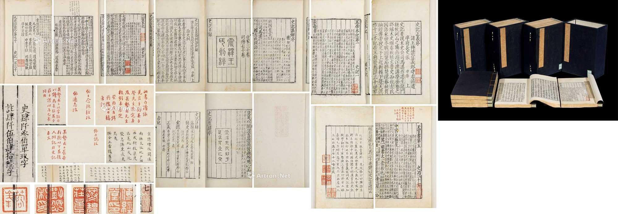 此本因字划板式一仍宋版原貌,以致有书贾将书中木记、刊记割去,赝充宋本。《嘉业堂藏书志》载刘承幹所藏王延喆本《史记》:“王跋七行,脱烂数字,天禄琳琅所藏亦然,且多为书估割去,伪充宋本。此本跋字独不脱烂,可宝也”。以上足见王延喆本《史记》之宝重。历年拍场全帙仅两见,为2009年春上拍白棉纸一部、2021秋上拍竹纸一部(无牌记及刻书跋),实属罕觏之书。拍品老装未衬,装为二十厚册,白棉纸精印,书品甚佳。天头有前人墨笔评语多处,审其笔墨古朴,实出通人之手。书中卷二十七天头有癸酉年椿年朱笔题识一则“此书句读依先君手录吴子登先生点定本,及吴挚甫先生校刻本参定”,据笔迹可辨书中批校为赵椿年于民国二十二年依清吴嘉善、吴汝纶校本手注。另据书中钤印,可知本书系嘉庆间苏州著名书画家、藏书家刘恕插架之物。