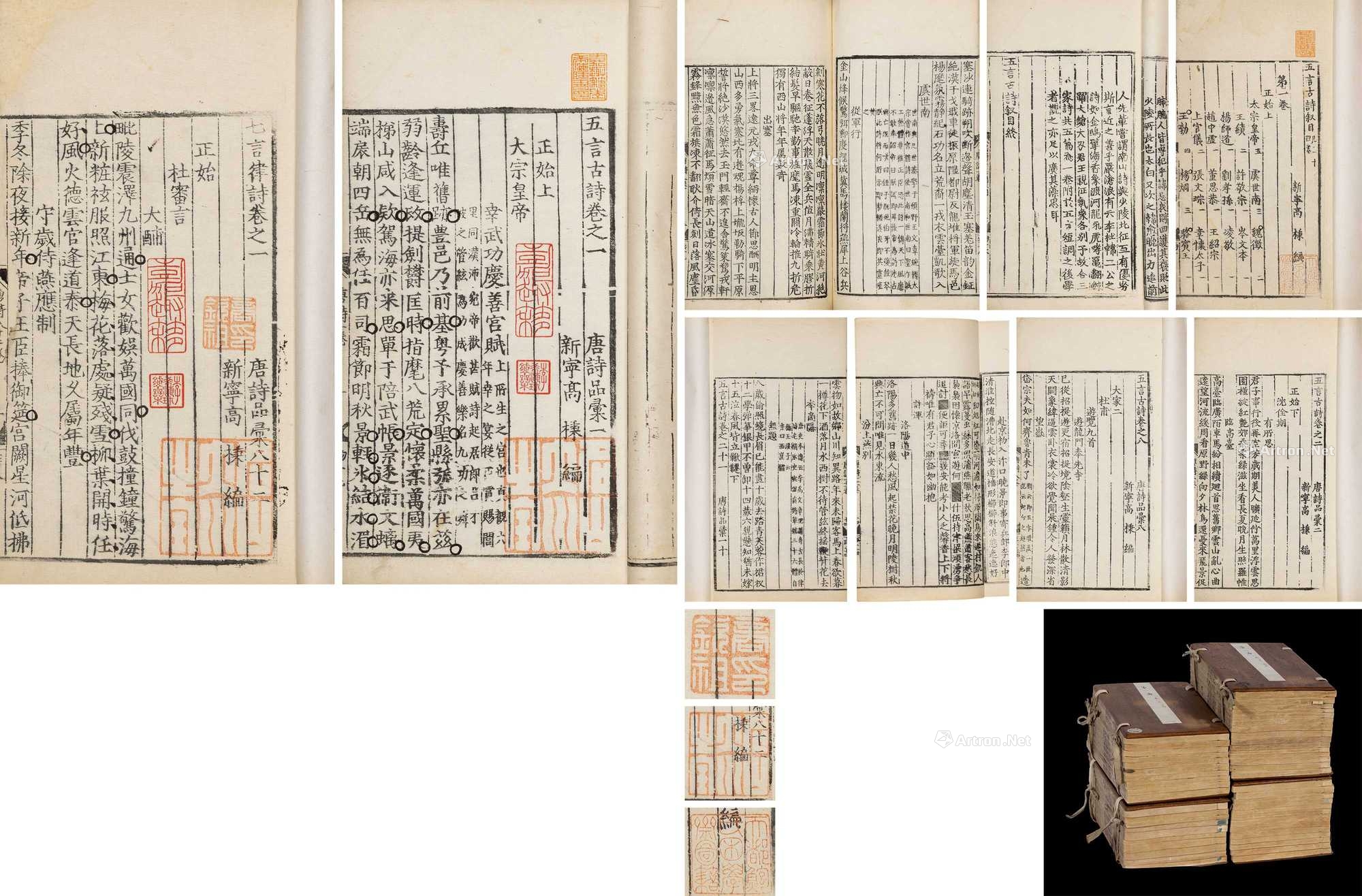 是书经《藏園群书经眼錄》《中国古籍善本总目》著录,公藏仅有上海图书馆等4家,皇皇巨著,稀见全本,为拍埸出现唯一一部,识者宝之。是书为高棅自明洪武十七年至洪武三十一年,花十余年心血采录由唐贞观至天祐280多年间,共620位诗人的5769首诗作。正集九十卷,按五言古诗、七言古诗、五言绝句、七言绝句、五言律诗、五言排律、七言律诗,7种体裁编次。据凡例所述:“大略以初唐为正始,盛唐为正宗、为大家、为名家、为羽翼,中唐为接武;晚唐为正变、为余响,方外异人等为旁流。间有一、二成家,特立自异者,则不以世次居之。”此为继承和发挥了严羽《沧浪诗话》的观点,为世人学习唐诗指明了正确途径,选诗和论析颇具识见,因而影响广泛。明弘治、正德间(1488-1521),前七子所见唐诗总集即为此弘治六年本,明代前七子将唐诗分期分为“四唐”之说,即源于《唐诗品汇》。前七子所标举“诗必盛唐”,即受此书影响。鲍廷博旧藏。