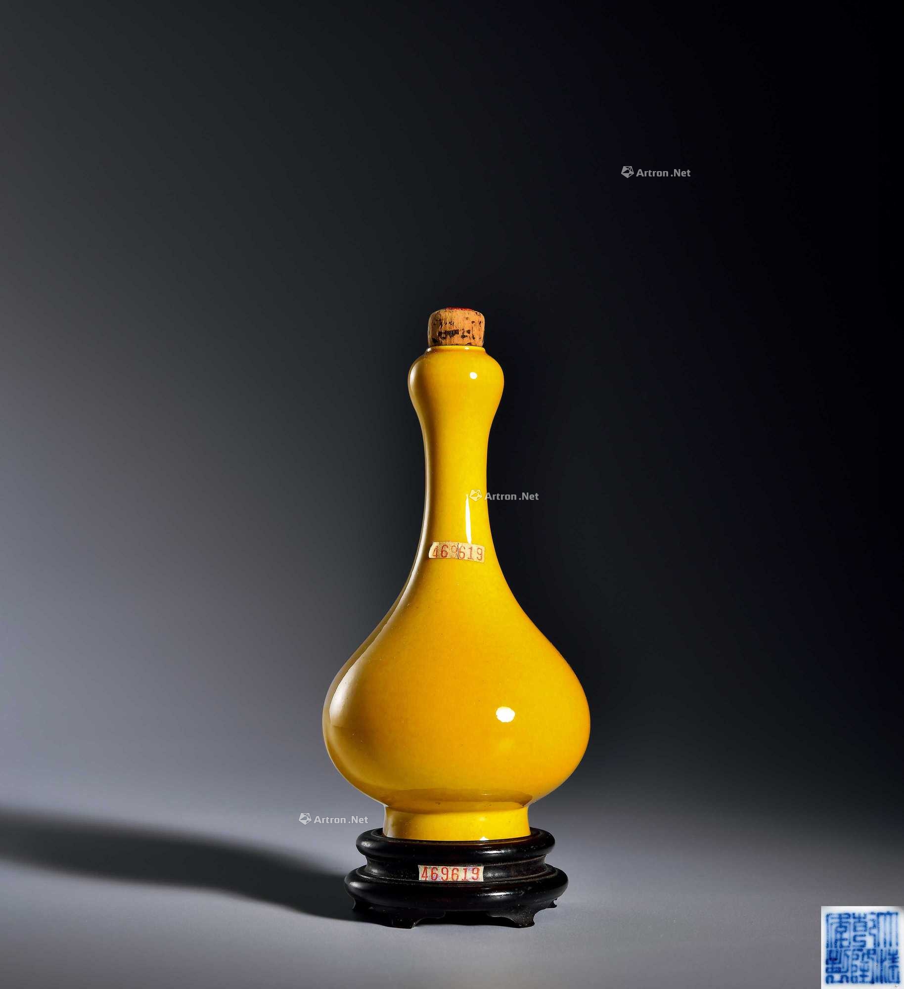 本品口呈蒜头型,细长颈,圆鼓腹,圈足,通体施黄釉,黄釉均匀淡雅,滋润厚腴,古雅静穆,胎骨细薄坚致,丽质怡人,远视之,宛若佳人玉立,风韵无限。圈足内青花“大清乾隆年制”六字三行篆书款。据《清宫内务府活计档案》记载:乾隆三年九月“初八日七品首领萨木哈来说太监毛团交……黄磁蒜头瓶一件……旨应配架座者配架座,内庭装格子用,钦此。”,此类“黄磁蒜头瓶”在档案中记载极少,可证存世罕见。极为珍视。