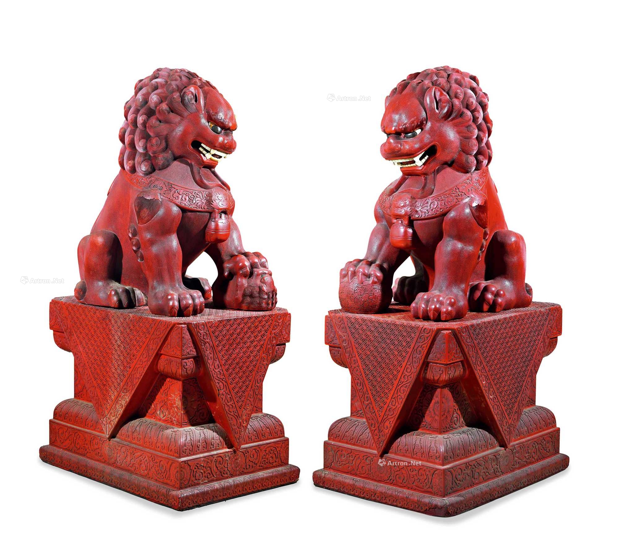 此对剔红狮子体量较大,髹漆厚重,刀法精细。狮子通高130厘米,通体采用剔漆工艺制成。狮子为蹲坐形态,狮子前脚踩球二目圆睁,张吻,披肩卷发,胸前垂挂铃铛,狮子前脚踩球。眼球镶嵌木变石,愈显其威武凶猛之态。在民间狮子有辟邪的作用,常用来守门,狮子又是兽中之王,显示主人的尊贵和威严。按照传统习俗,成对的狮子是左雄右雌,可从狮子所踩之物来辨别,蹄下为球,象征统一寰宇和无上权利,必为雄狮。蹄下踩着幼狮,象征子孙绵延,是雌狮。狮子还有南狮北狮之分,北狮威严雄壮,南狮活泼有趣。狮子对我国文化的影响是多方面的,大家熟知的狮子舞,最迟在唐代已风靡各地,至今不衰。本文介绍的狮子从使用功能分析,应是大殿的陈设品,供人们赏玩。从目前所掌握的材料看,传世的狮子一般为体量在长50厘米左右,有四腿直立,胸前挂有铃铛者;也有脚踩绣球或幼狮者。像这对狮子的造型,是与陈设在宫殿门前的铜或铜鎏金狮子的造型相同,如故宫太和门前陈设的铜狮,由于采用的是精美的雕漆工艺,体量又比那些铜鎏金狮子大,故是陈设在室内之物。其保存之完整,流传之有序,比较罕见。