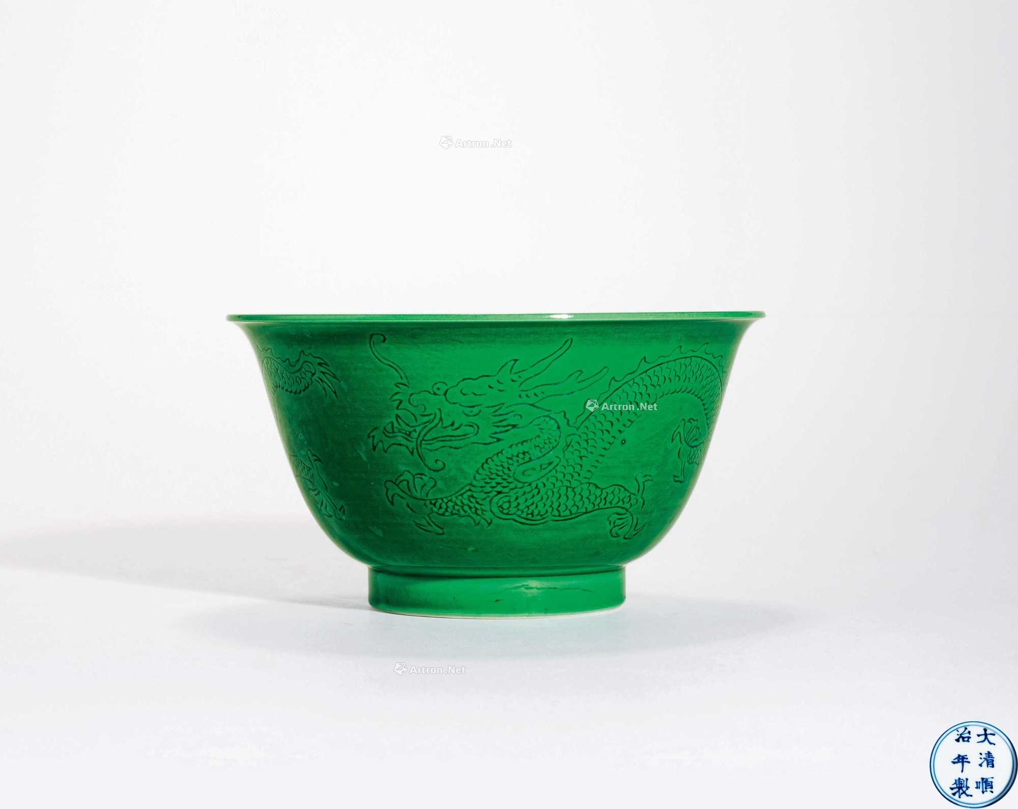 本品撇口弧腹,下承圈足,尺寸小巧,却不失端庄之气。碗内外壁通施瓜皮绿釉,釉色浓绿莹亮,翠色怡人。外壁胎体之上锥龙纹,刀法细腻娴熟,布局紧凑而不繁乱,足见匠师功力之深厚。碗底心施白釉,双圈内青花书“大清顺治年制”六字双行楷书款,款识书写工整,是极为少见的顺治官窑款识。