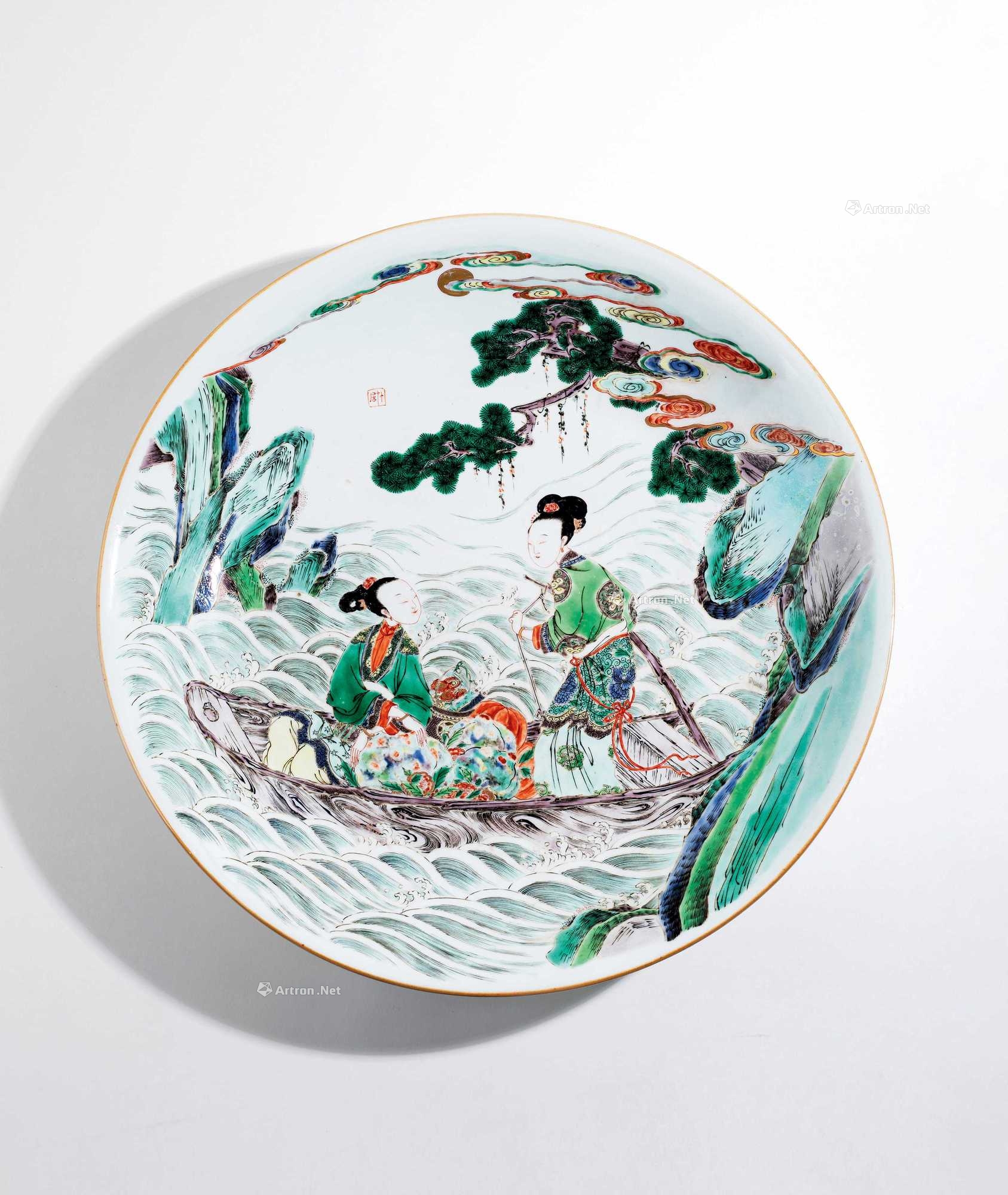 此大盘造型秀雅,敞口,弧壁,下承一圈足,通体施白釉,釉色洁白无瑕,釉面莹润肥厚,胎质坚质。盘心以五彩绘画主题纹饰瑶池祝寿图,取自葛洪《神仙传》三月三日王母寿辰设蟠桃盛会,各路神仙同往赴会中一景。画面中苍石嶙峋,海浪翻滚,彩云缭绕,两位仙女乘于仙船,踏浪而来,气势恢宏。慈祥和蔼,体态雍容,生动传神,仙船上携蟠桃及宝物寿礼,其构图考究, 人物线条毫厘不差,极细极匀,色透骨而露彩,点染生动,出于丹青之上,意笔高古,颜色深入釉骨,非庸手能及,将五彩瓷绘画的技术和艺术水平推向了极致,实乃清康熙帝大寿供御之精品也。