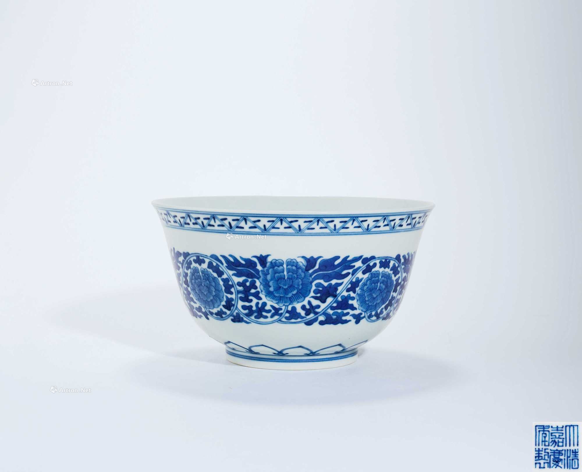 缠枝莲纹碗为清宫用瓷传统样式,拍品敞口微撇,深弧腹,圈足通体施加白釉,外壁以青花装饰,口沿绘折线三角几何纹一周,腹部主体绘缠枝花卉,为一周缠枝花朵纹带,花卉朵朵硕大,叶片丰满,缠枝流畅;胫部绘如意云头纹。绘制细腻精雅,青花发色艳丽明快。底青花书「大清嘉庆年制」六字三行篆书款,款识工整。整器白釉纯如凝脂,青花浓淡有度,发色匀净自然,雍容沉静,为典型嘉庆官窑青花器,故宫博物院有类似收藏。此类缠枝花卉纹饰沿袭于万历朝,至清代笔触更为流畅精美,多流行于道光一朝。其纹饰也寓意吉祥,缠枝藤蔓优美生动,因其连绵不断,寓王朝「生生不息」之意。