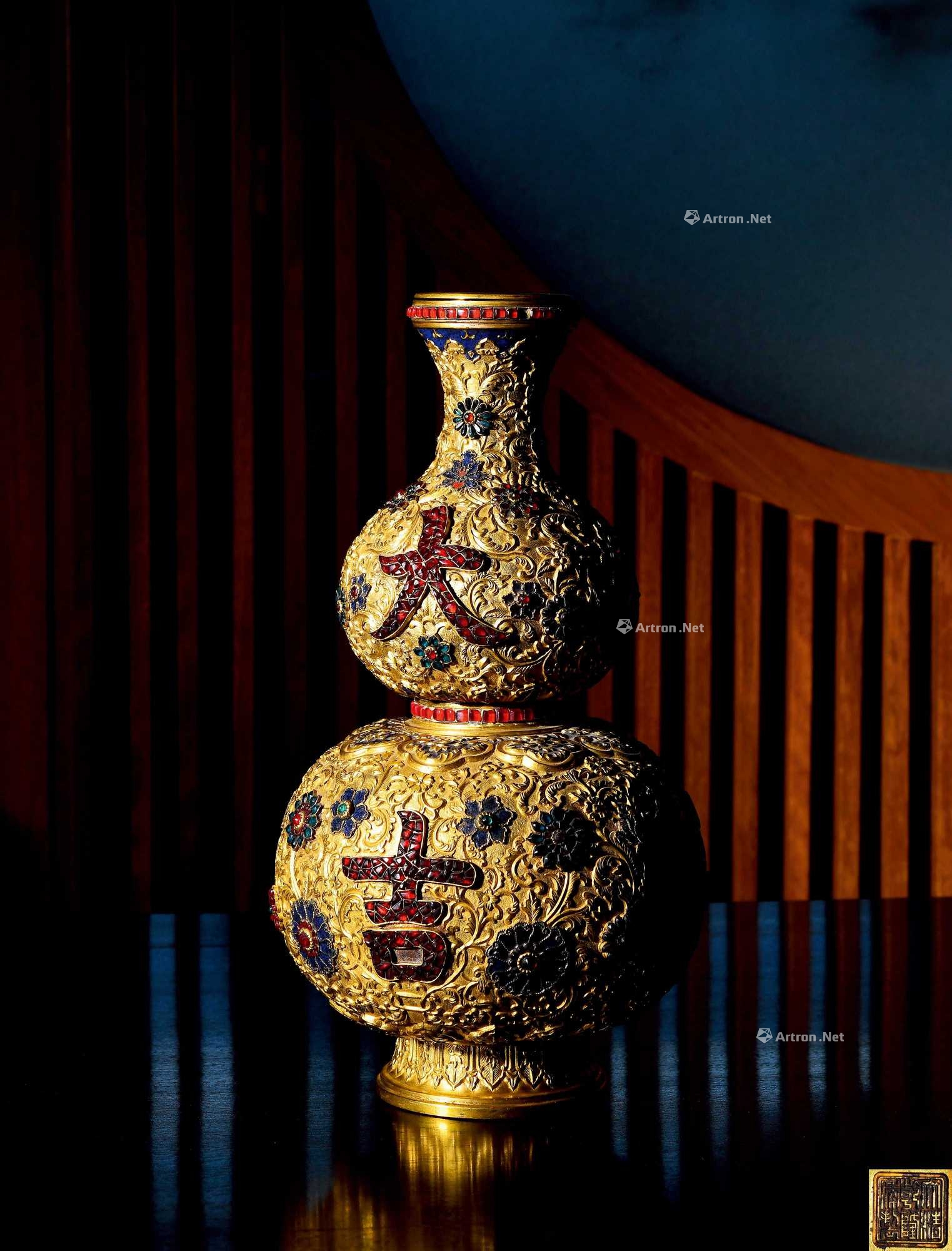 参 阅:北京保利5周年秋季拍卖会Lot4679清乾隆 铜鎏金嵌宝石料“大吉”葫芦瓶成交价RMB 4,480,000