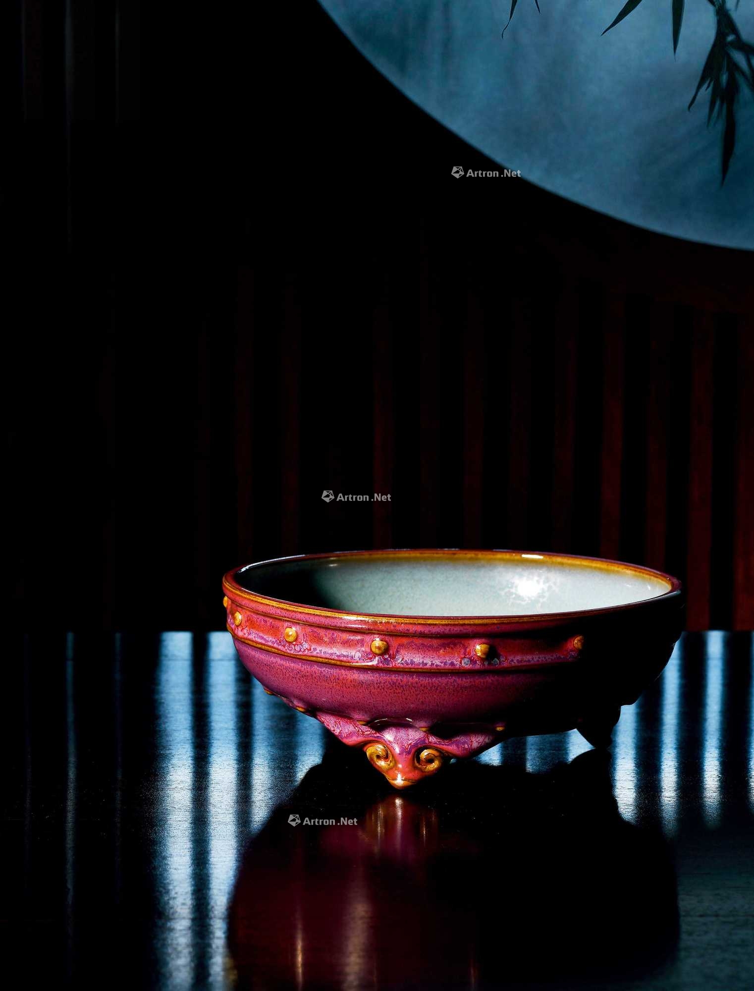这件仿宋钧窑鼓钉洗,是典型的唐英用禹县神垕镇原料仿烧的精品,也是流传到社会上的极为罕见的一件。吴尧圃从神垕镇开采的这一批原料有多稀少呢,我们可以从乾隆皇帝的御批里一见端倪。乾隆皇帝给唐英交代了仿烧宋钧窑的任务,要求烧成几件带款的仿宋钧窑、几件不带款的仿宋钧窑,为了烧造这些瓷器,乾隆皇帝一共拨付给唐英“六十三斤八两”原料。需要皇帝旨意、按核算的用量严格拨付,数量上精确到两,可以看出这批原料的管理之严格、品种之珍贵。因此,用这批原料烧成的仿宋钧窑已经极为稀少,流出清宫的更是凤毛麟角,难得一见。