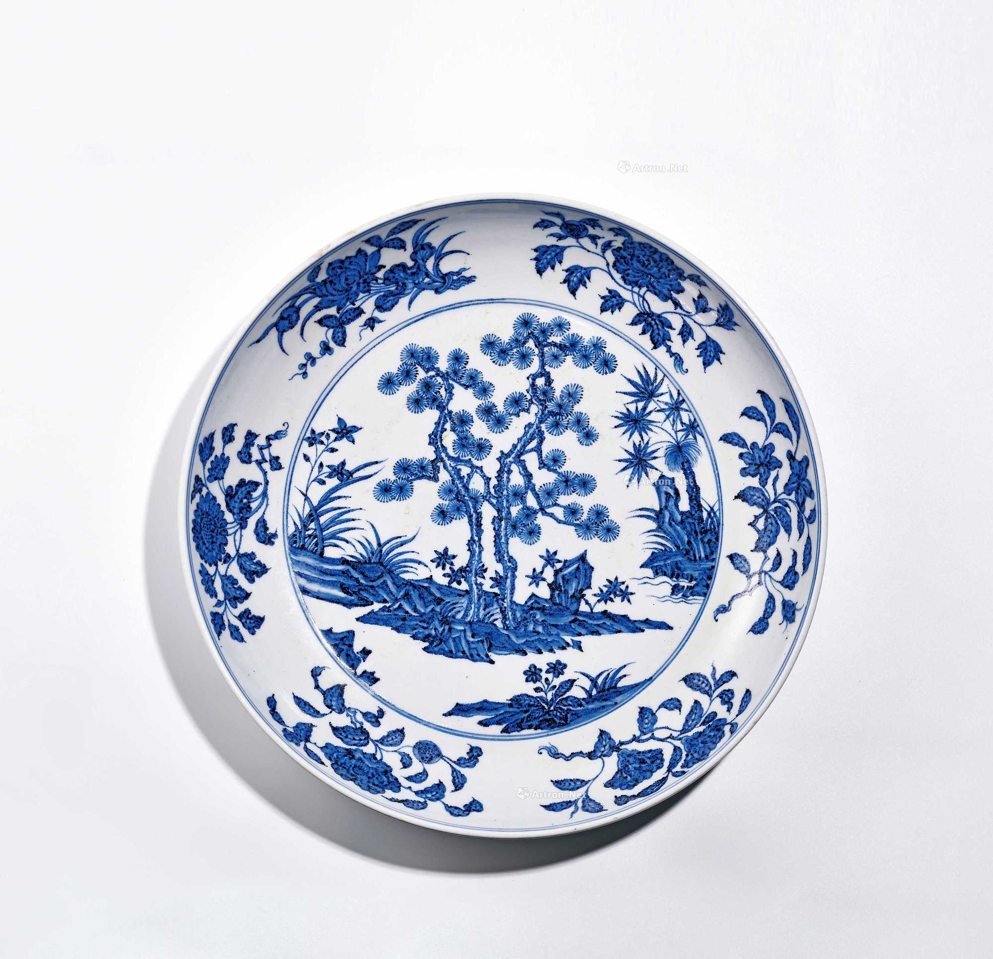 此拍品在拍卖市场中极为少见,玫茵堂曾藏一例明永乐青花『岁寒三友』图大盘,著录于《玫茵堂中国陶瓷》,康蕊君,伦敦,1994-2010年,卷4,编号1640。后在苏富比2011年4月7日释出,编号0047。亦有一件相若明永乐青花岁寒三友纹盘,属于F.G.and E.H.Morrill收藏,借展波士顿美术馆,收录于Daisy Lion-Goldschmidt,《Ming Porcelain》,伦敦,1978年,图版5,先后售于伦敦苏富比1967年11月14日,编号97,后1988年11月29日,编号179,以及香港佳士得1997年4月28日,编号665。