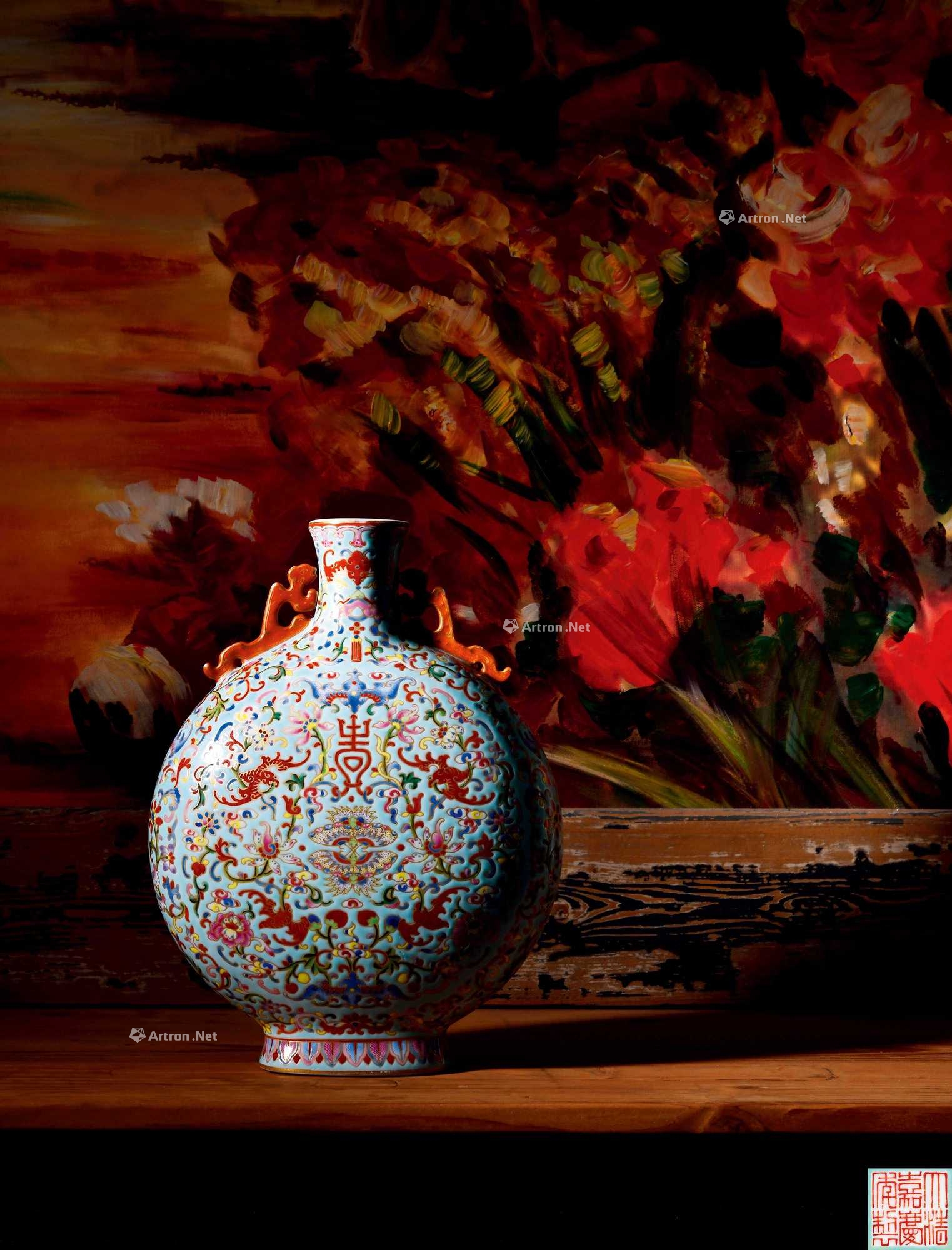 粉彩瓷又叫软彩瓷,是景德镇窑四大传统名瓷之一。粉彩是一种釉上(彩绘经低温烧成的彩绘方法。粉彩也叫“软彩”,是釉上彩的一个品种。所谓釉上彩,就是在烧好的素器釉面上进行彩绘,再入窑经摄氏600度至900度温度烘烤而成。粉彩瓷器是在康熙五彩基础上,受珐琅彩制作工艺的影响而创造的一种釉上彩新品种,始见于康熙晚期,后历朝流行不衰。粉彩瓷的彩绘方法一般是,先在高温烧成的白瓷上勾画出图案的轮廓,然后用含砷的玻璃白打底,再将颜料施于这层玻璃白之上,用干净笔轻轻地将颜色依深浅浓淡的不同需要洗开,使花瓣和人物衣服有浓淡明暗之感。由于砷的乳浊法作用,玻璃白有不透明的感觉,与各种色彩相融合后,便产生粉化作用,红彩变成粉红,绿彩变成淡绿,黄彩变成浅黄,其它颜色也都变成不透明的浅色调,并可控制其加入量的多寡来获得一系列不同深浅浓淡的色调,给人粉润柔和之感,故称这种釉上彩为“粉彩”,在表现技法上,从平填进展到明暗的洗染;在风格上,其布局和笔法,都具有传统的中国画的特征。早在清朝康熙后期,景德镇的粉彩瓷就已问世,雍正时相当精致,乾隆年间达到很商的艺术水平。此器扁圆形,侈口,束颈,丰肩圆鼓腹,颈肩两侧对称饰夔龙耳,椭圆形高圈足,足端略外撇。颈及腹满饰缠枝花卉纹饰,画工细腻,中心位置绘红色蝙蝠,寓意洪福齐天,围绕一双蝴蝶,暗合花蝶连绵之意,层次丰富,寓意美好,底书“大清嘉庆年制”六字三行篆书款,为嘉庆朝精品。此器纹饰华美,色彩鲜艳明丽,形态隽秀,极富收藏价值。