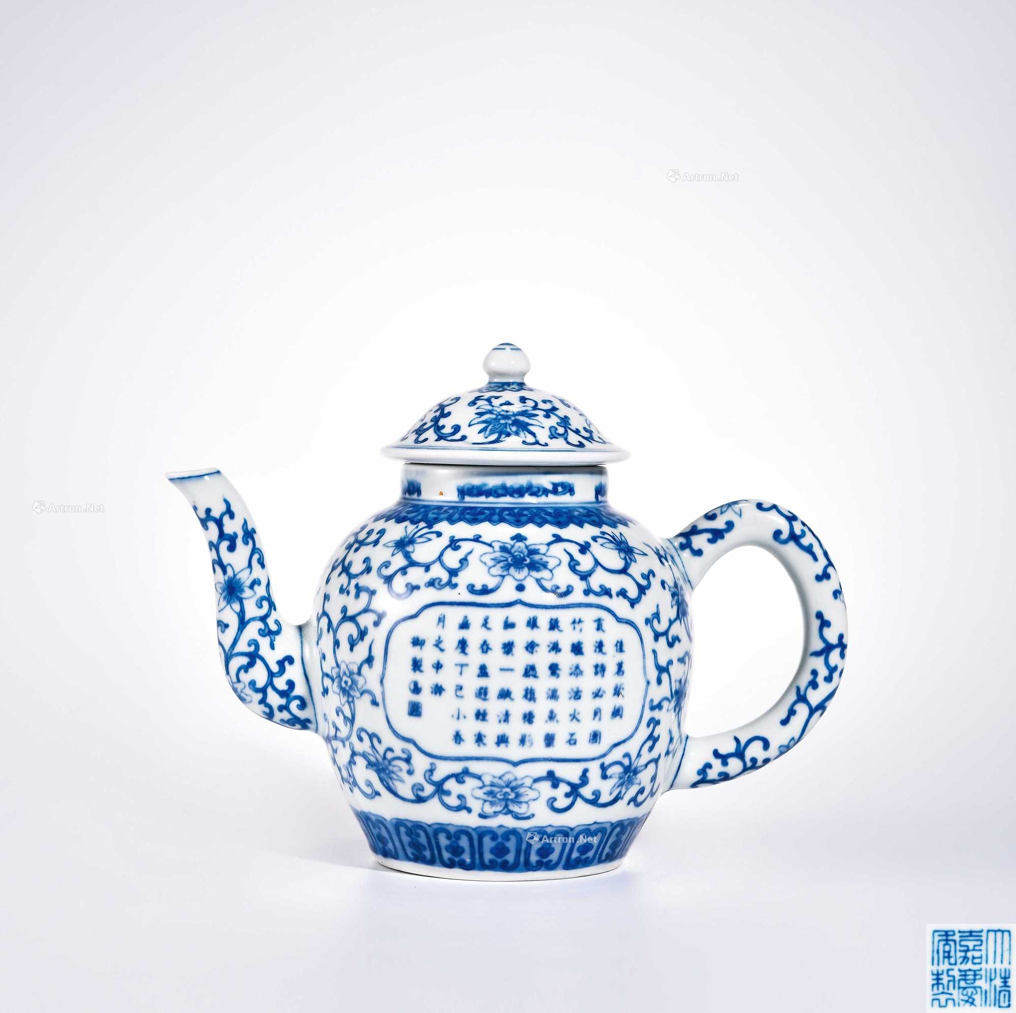 本品直口,圆腹,长流,曲柄,矮圈足。外壁以青花装饰,腹部饰缠枝花卉纹,中央海棠形开光白地内以青花书嘉庆丁巳(嘉庆二年,1797年)御制诗一首:“佳茗头纲贡,浇诗必月团。竹炉添活火,石铫沸惊湍。鱼蟹眼徐扬,旗枪影细攒。一瓯清兴足,春盎避清寒。”下并有“嘉庆丁巳小春月之中瀚御制”款识,及“嘉”“庆”朱文章两枚。题诗字体端丽秀逸,排列工整,与花卉纹饰对照分明。施釉丰润亮泽,各方面都配合得宜,烧制水平之高与乾隆时期者可谓无异。外底心以青花书“大清嘉庆年制”六字三行篆书款。