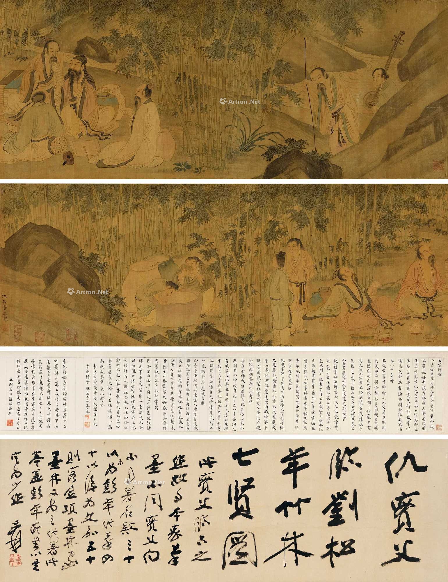 引首:仇实父临刘松年《竹林七贤图》。此实父临古之作,故与本家笔墨不同。实父向不自署名款,三十以来为彭年代笔,四十以后为文嘉,五十则客居项墨林家,墨林又为之代署。此卷盖彭年所书,以是定为少作。爰。钤印:大千唯印大年