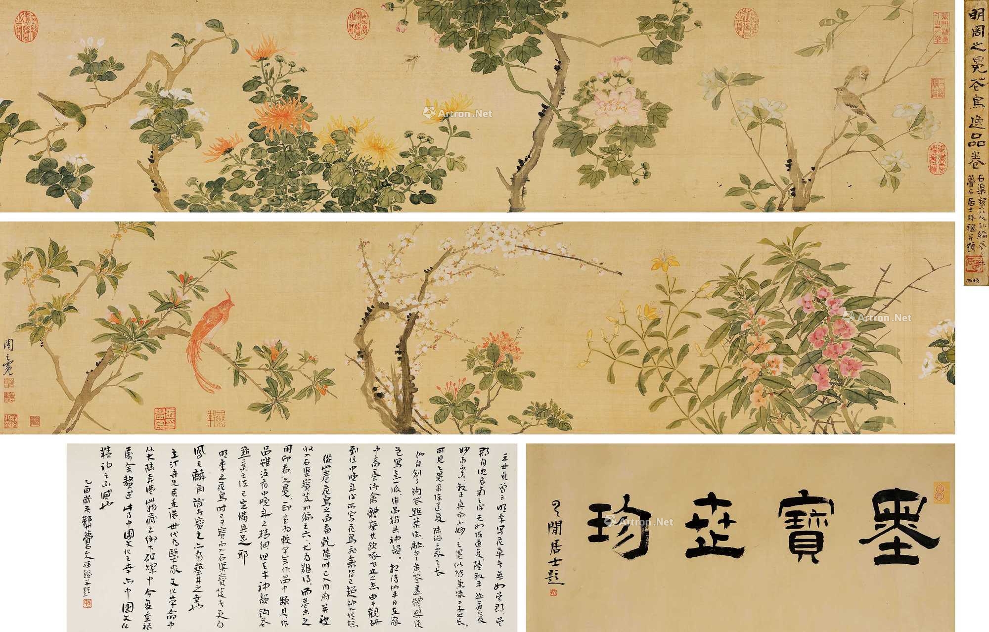 题签:明周之冕花鸟品卷,石渠宝笈初编卷之六,梦石居士拜鑑并题。钤印:梦石