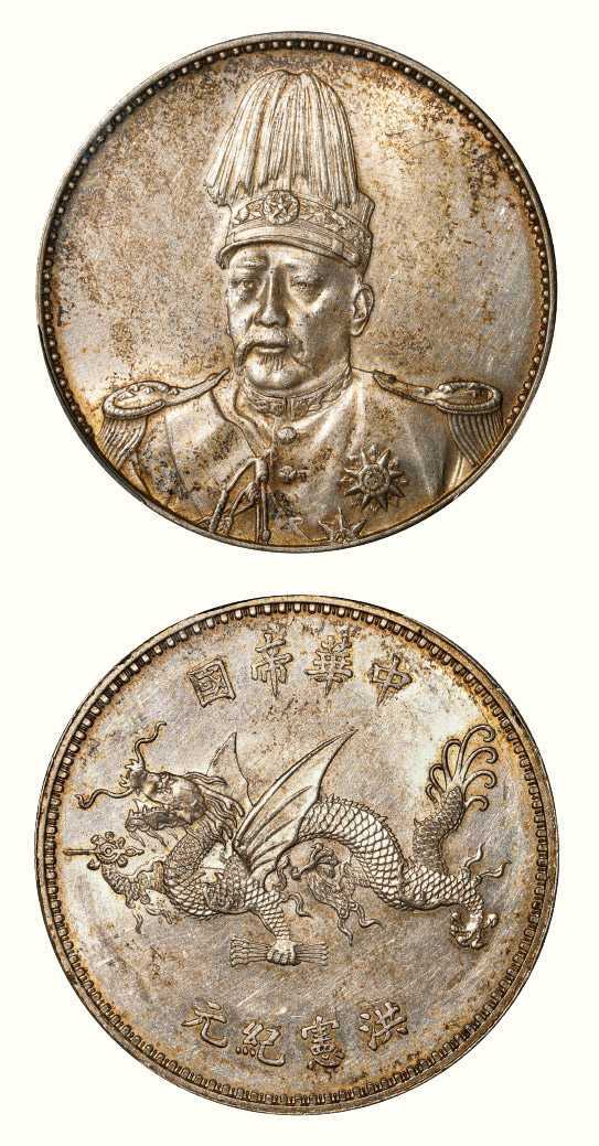 1916年袁世凯像中华帝国洪宪纪元飞龙纪念银章以46万元成交;清光绪三十年湖北省造大清银币库平一两以41.4万元成交。