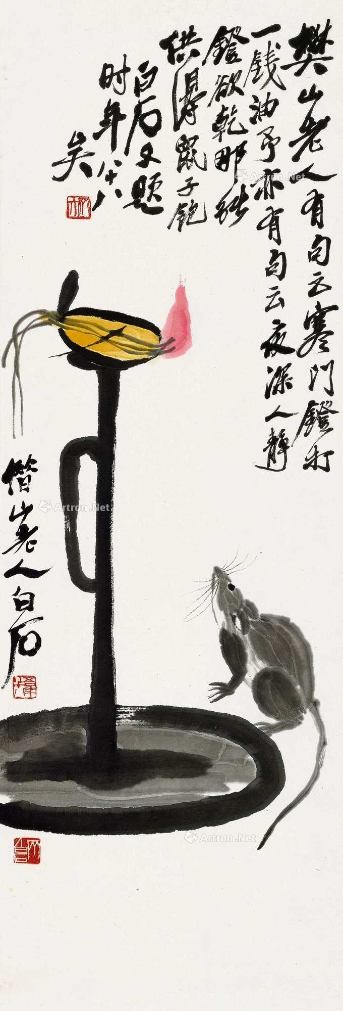 2.樊山老人有句云:寒门灯打一钱油。予亦有句云:夜深人静灯欲干,那能供得鼠子饱。白石又题,时年八十八矣。