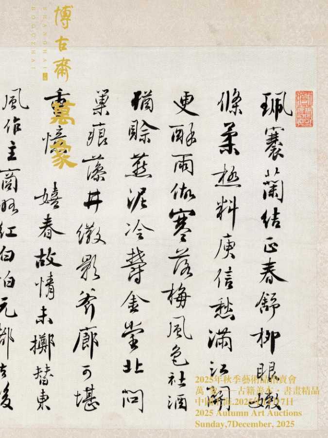 上海博古斋2025年秋季艺术品拍卖会预展将于12月5日在朵云轩艺术中心隆重启幕。预展现场将重点呈现数类珍品:包括见证近代中外文化交流的王国维、廉泉等名家信札;体现清代金石学人鉴藏脉络的张廷济旧藏碑帖;以及严复手书词稿、黄侃篆书等近现代文人墨迹。此外,明清书画、地方文献等系列藏品亦将一并展出,亮点纷呈。我们诚邀您拨冗莅临,共鉴收藏。预展持续至12月6日,拍卖会将于12月7日举槌,期待与您在朵云轩艺术中心相遇!